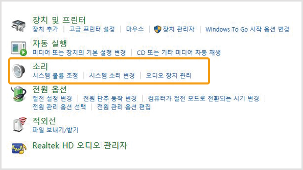 제어판 창이 뜨면 '소리'를 클릭합니다.