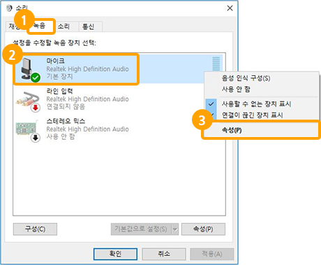 녹음 탭을 클릭한 후, 마이크에 마우스 오른쪽 클릭을 해주시고 ‘속성’을 클릭합니다.