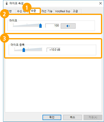 수준 탭을 클릭한 후, 마이크 볼륨이 켜져 있는지 확인 해주시고 마이크 증폭을 설정해줍니다.