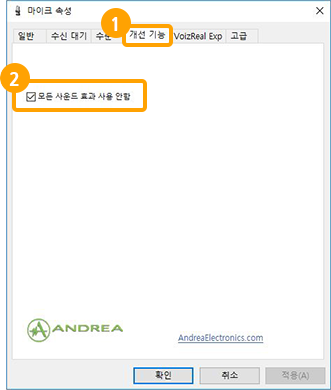 개선 기능 탭을 클릭한 후 ‘모든 사운드 효과 사용 안함’을 체크해줍니다.