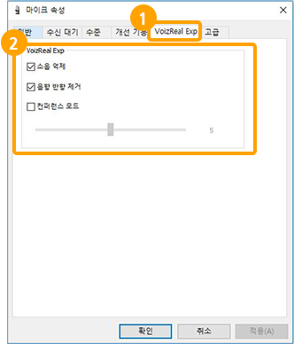 만약 개선 기능 탭이 없을 경우, voizReal EXP 탭에서 소음 억제, 음향 반향 제거를 체크해줍니다.