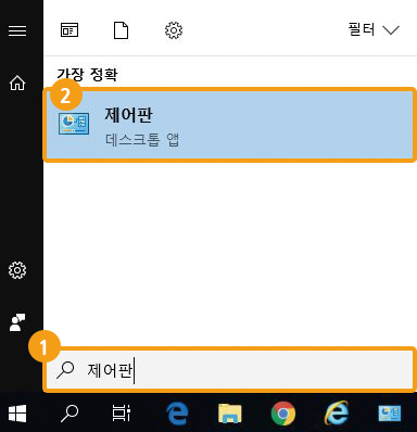 하단 작업 표시줄 왼쪽의 돋보기 모양을 클릭 후 '제어판'을 검색하여 클릭합니다.
