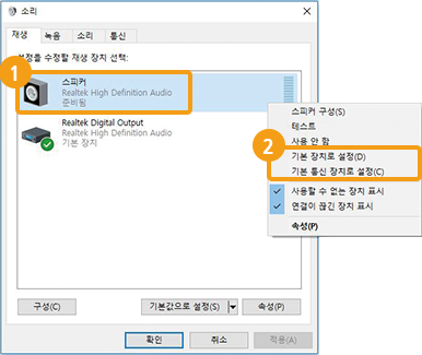 스피커에 마우스 오른쪽 클릭 후, 기본 장치로 설정합니다.