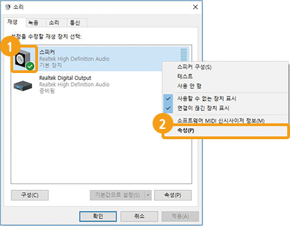 스피커에 체크 표시를 확인하신 뒤 마우스 오른쪽 클릭 후, 속성을 클릭합니다.