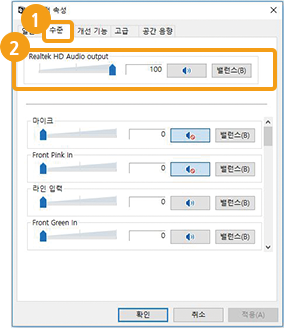 스피커에 '수준'탭을 누르신 뒤 볼륨을 확인합니다.