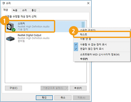 다시 스피커에 마우스 오른쪽 클릭 후 '텍스트'를 클릭하여 소리 여부를 테스트합니다.