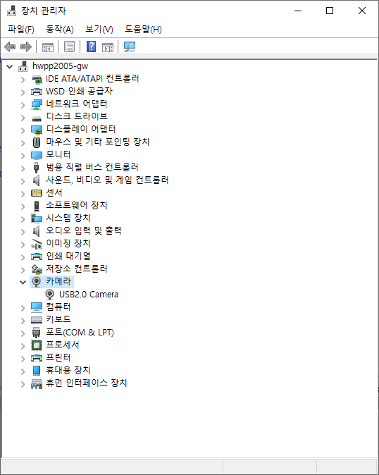 장치 관리자 창에서 카메라 아래에 연결한 웹캠이 정상적으로 설치되었는지 확인합니다.